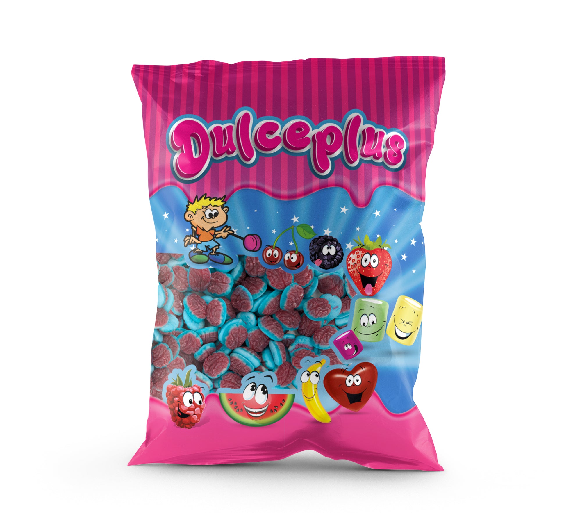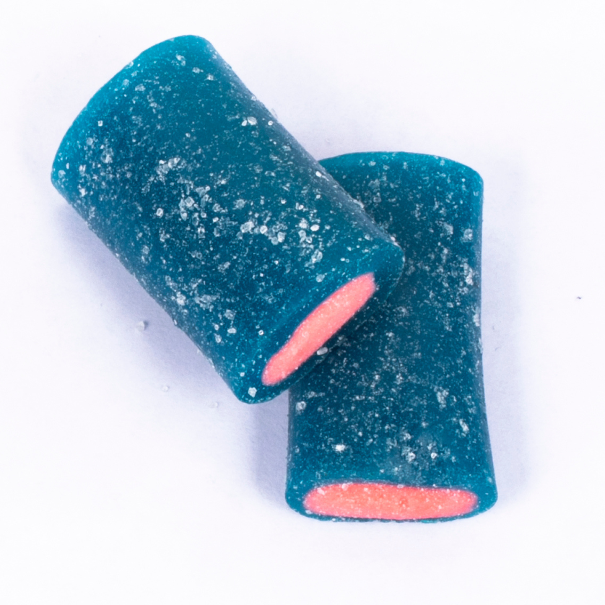 Brain-shaped sweets with a striking blue base, red center, and white top for a fun, eye-catching look. They have a...