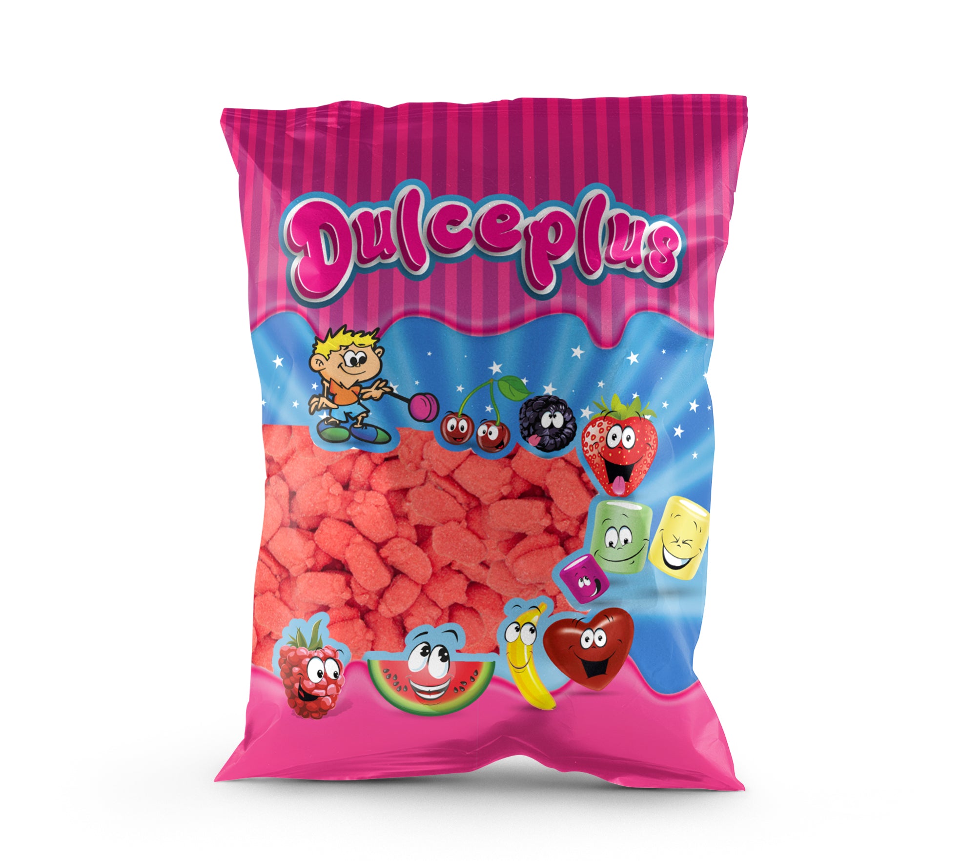 Strawberry-shaped sweets with a vibrant red color and a crunchy sugar coating. They have a sweet strawberry flavour and a...